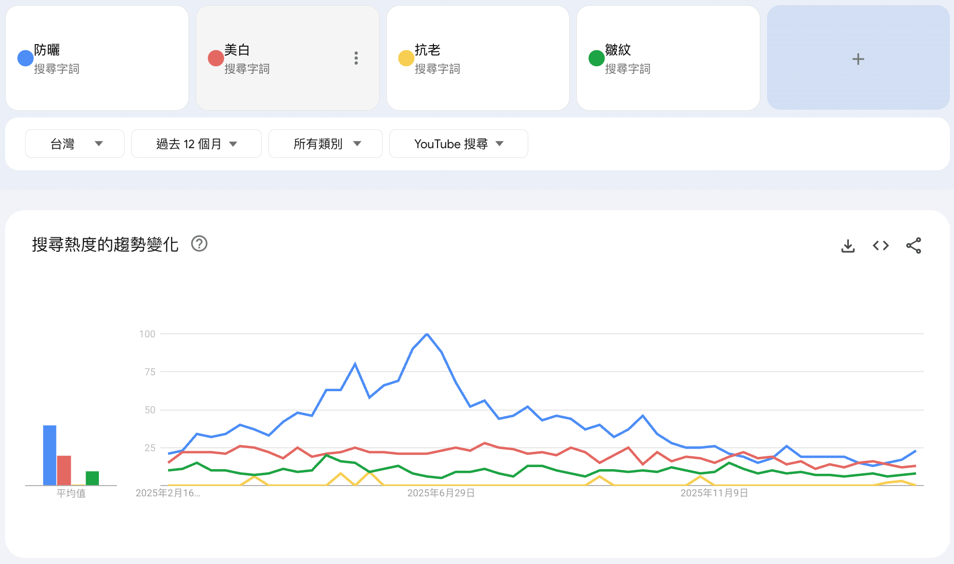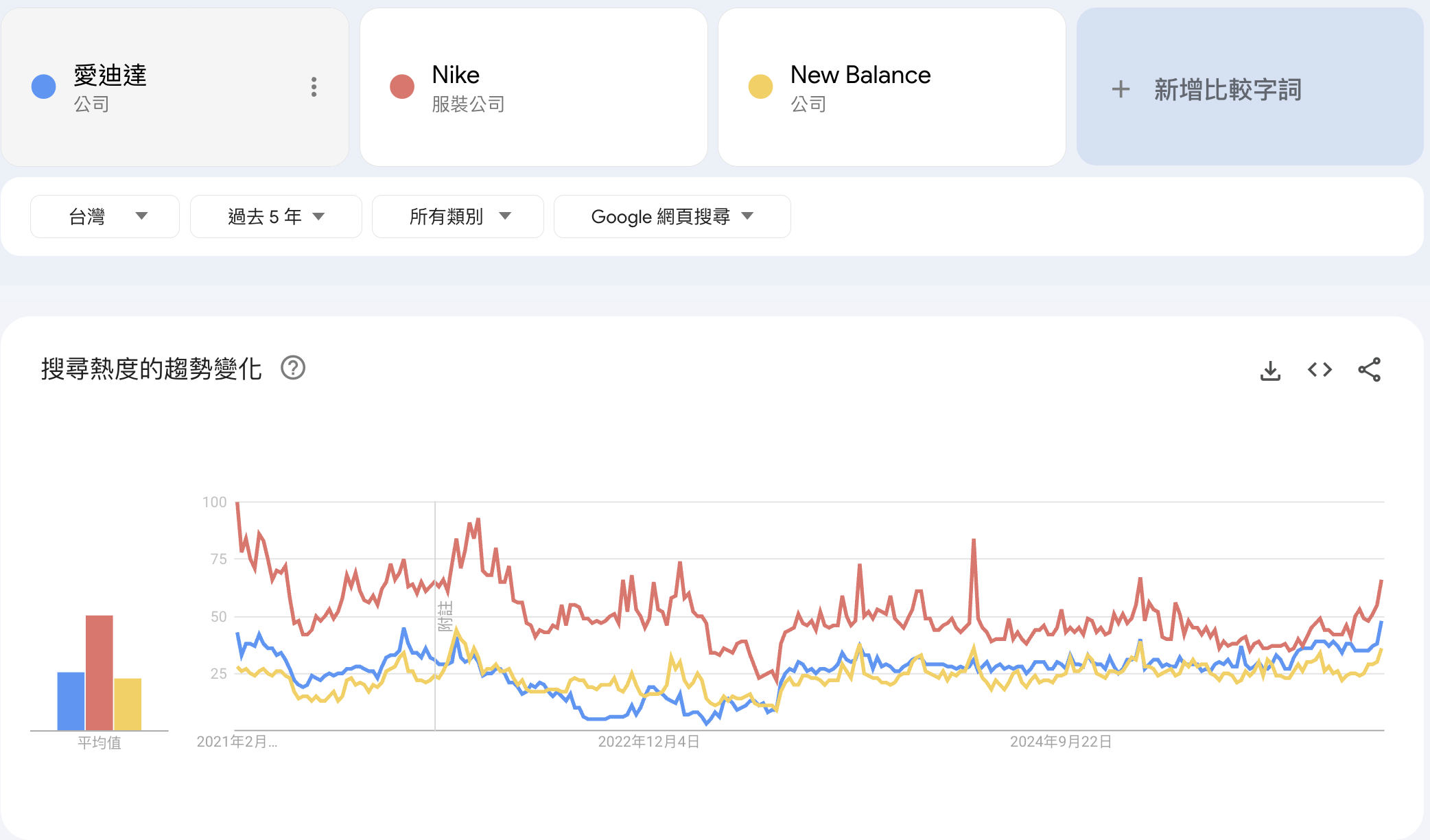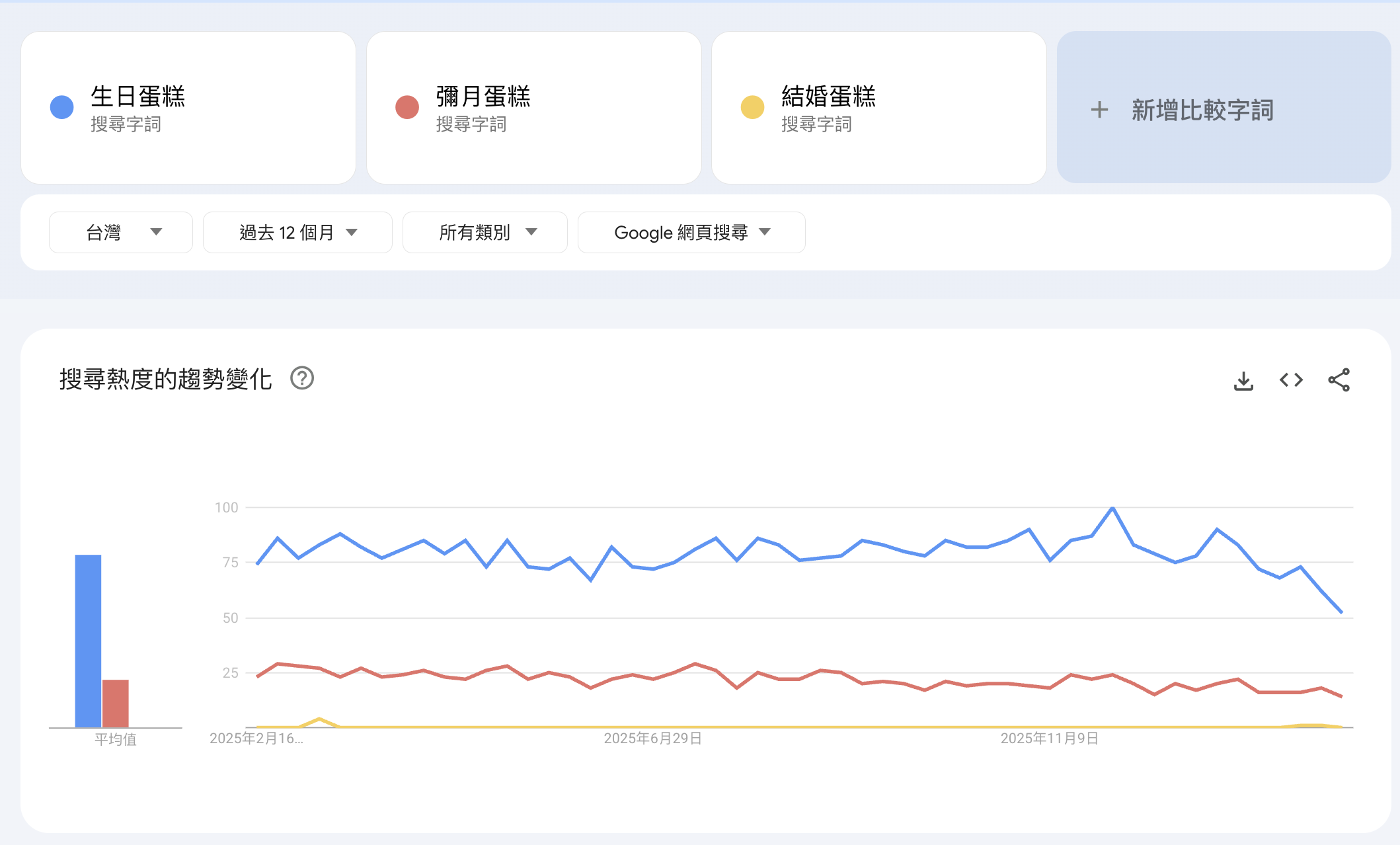 - 比較的是相對熱度:在同張圖裡,100 會被分配給搜尋量最大的那組詞,其他詞的數字是相對於它的比例