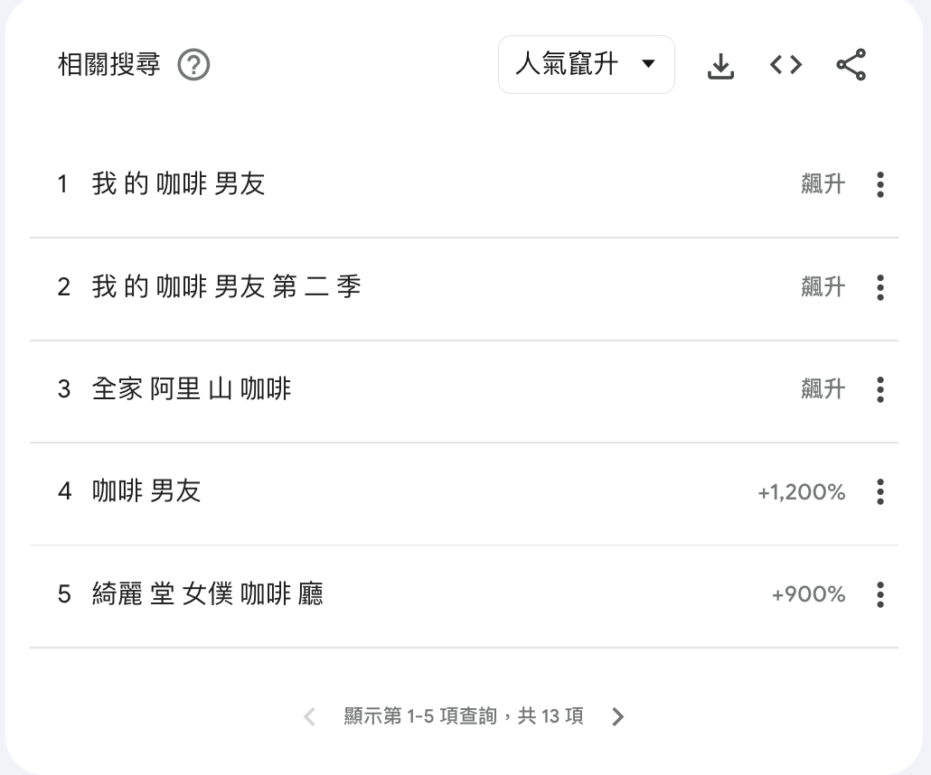 它反映的是趨勢變化和相對比較,不是實際搜尋次數。如果你需要估算實際搜尋量,要搭配 Google 關鍵字規劃工具 使用。