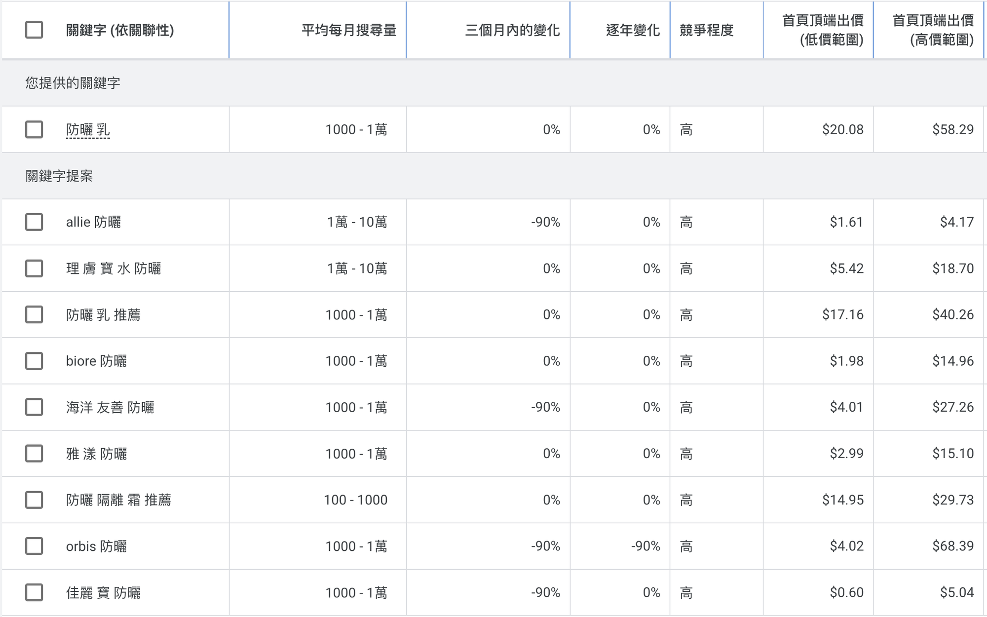 現在我們再把防曬乳放到 Google 關鍵字規劃工具查詢,發現搜尋量大、競爭程度也高:
