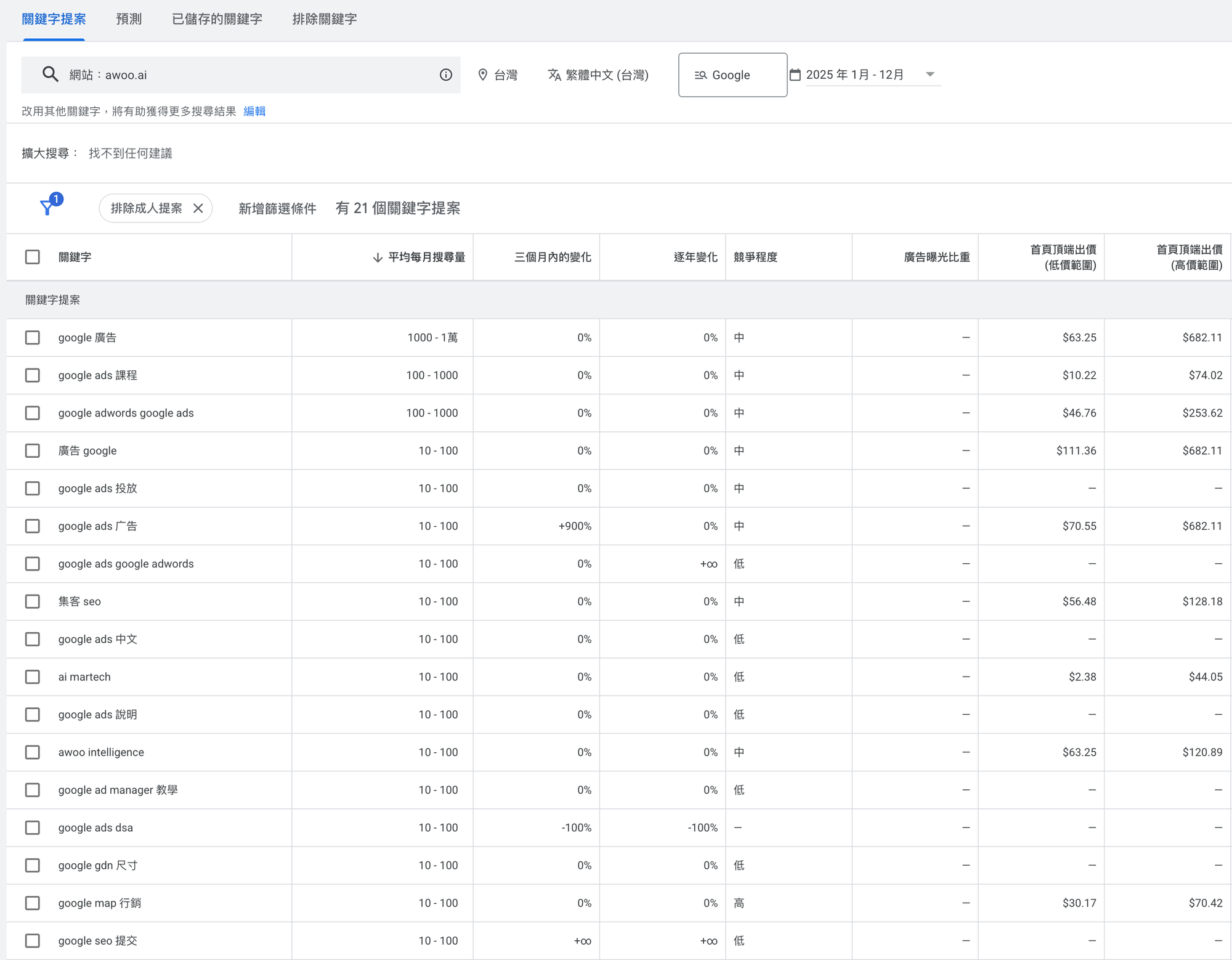 以上圖來舉例,如果你有提供 google 廣告服務或課程,那麼 awoo.ai 可能是你的競爭對手。照步驟一二操作後你會發現,「Google Ads 課程」、「AI Martech」、「集客 SEO」、「awoo intelligence」、「Google Map 行銷」看起來像是適合你經營的藍海。